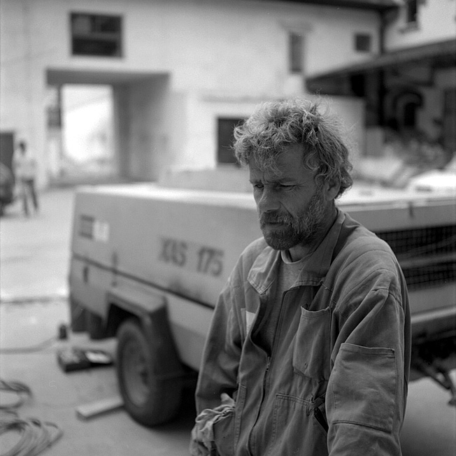 Jde o jedinou fotku z foto-jednoaktovky Workers II. Tato mini-esej si klade za cíl dokumentovat náročnou práci dělníků na dvoře pod okny naší kanceláře (tmavé okno vlevo nahoře nad průjezdem).